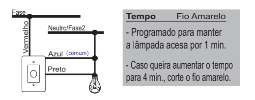 Programado para manter a lâmpada acesa por 1 min, caso queira aumentar o tempo para 4 min, corte o fio amarelo